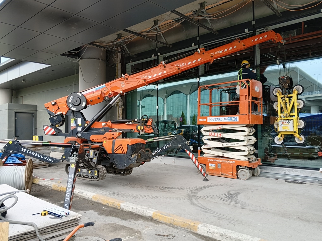 Bu nedenle cam montajı projelerinde genellikle örümcek vinç + makaslı platform kombinasyonu tercih edilmelidir.